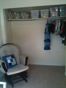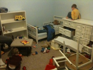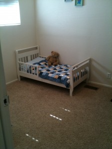 I decided that room was for sleeping. Well what do kids need to sleep…beds, pillows, blankets and a stuffed animal. So that’s all that is in their room. ok ok well you caught me that’s not all that’s in there but almost. I kept the rocking chair in there so we could read stories before bed and the books are up in the closet and I have a few boxes of out of rotation toys store in the top of the closet (I like to rotate toys every so often). But that’s it , really.Here is a picture to prove it 🙂